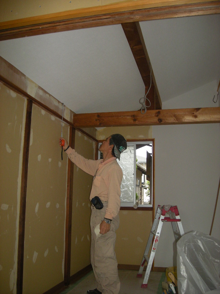天井の桁廻りもクロスを張るため、その下地となるベニヤを桁廻りに張って行きます!!