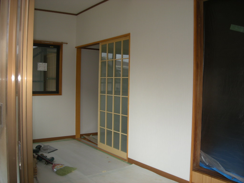 建具の取付けの完了です。広縁側の内装(クロス張り)工事もほぼ終わりました!!