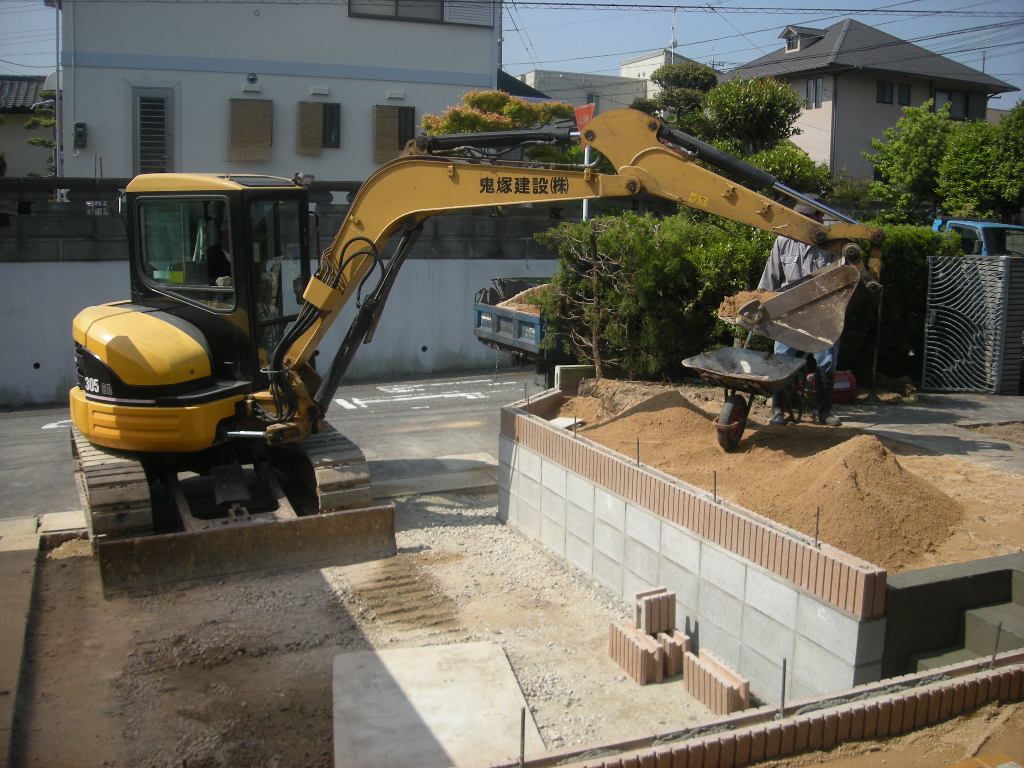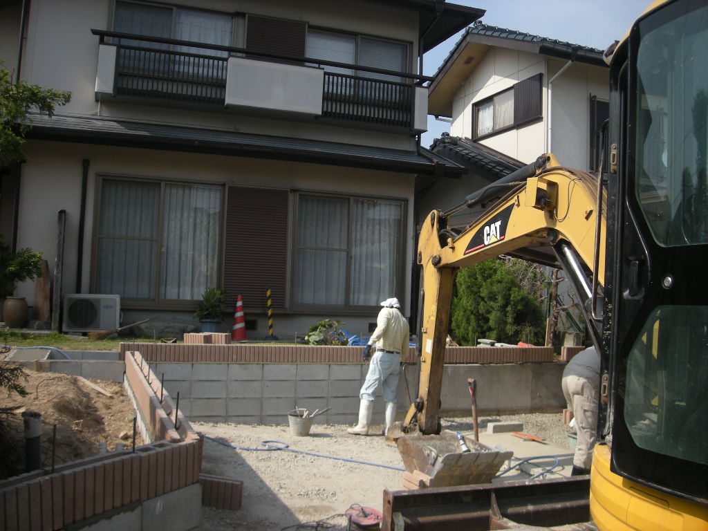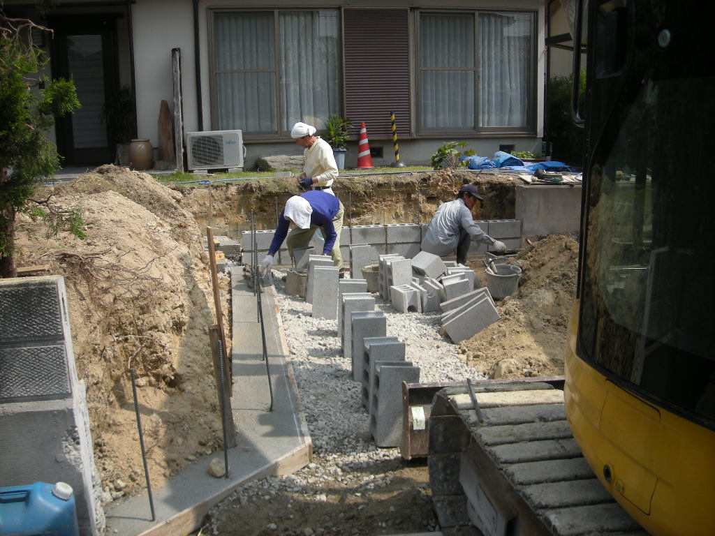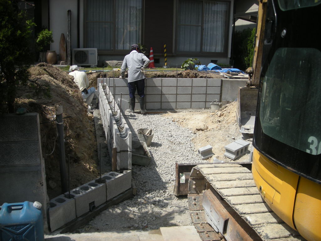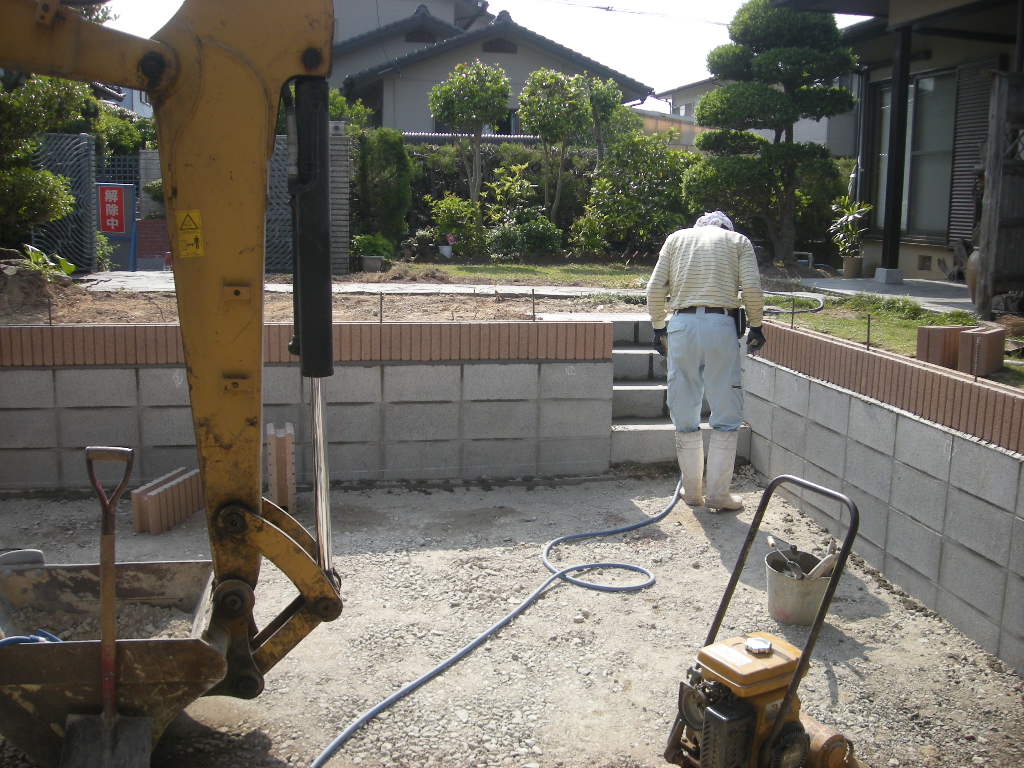化粧ブロックを1段積んだところで、敷地内の植木を撤去して出来た窪み部分にマサ土を入れます!!
