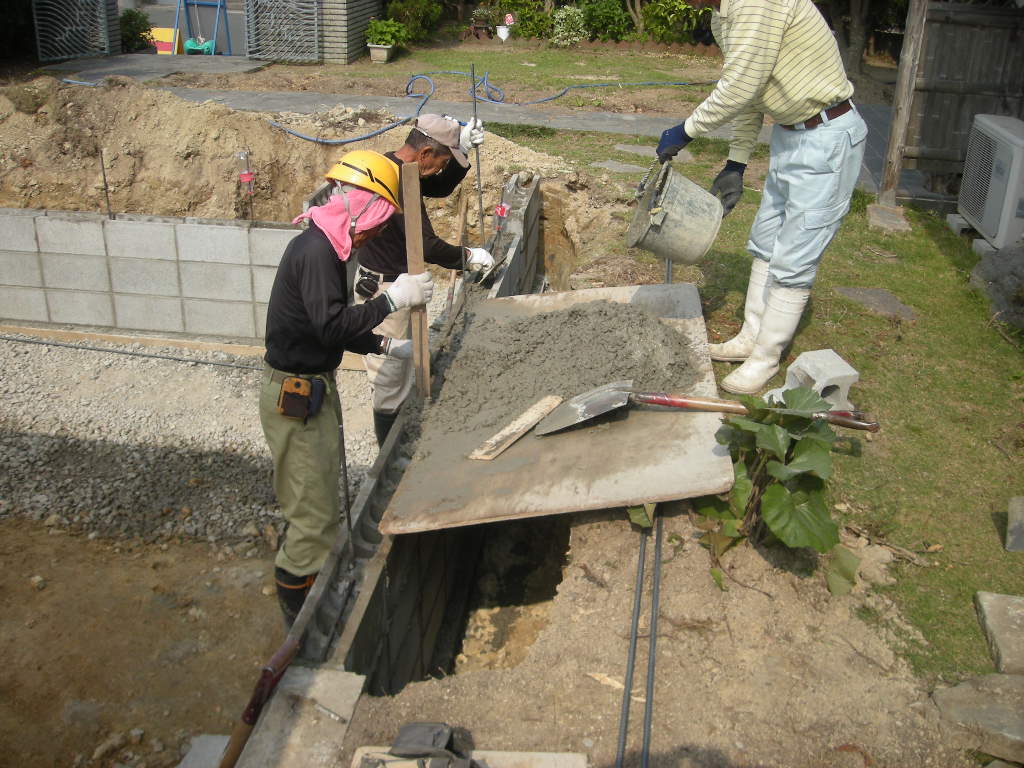 ブロックの施工が終わったら次は擁壁の強度を増すためにブロックの穴の中に生コンを
