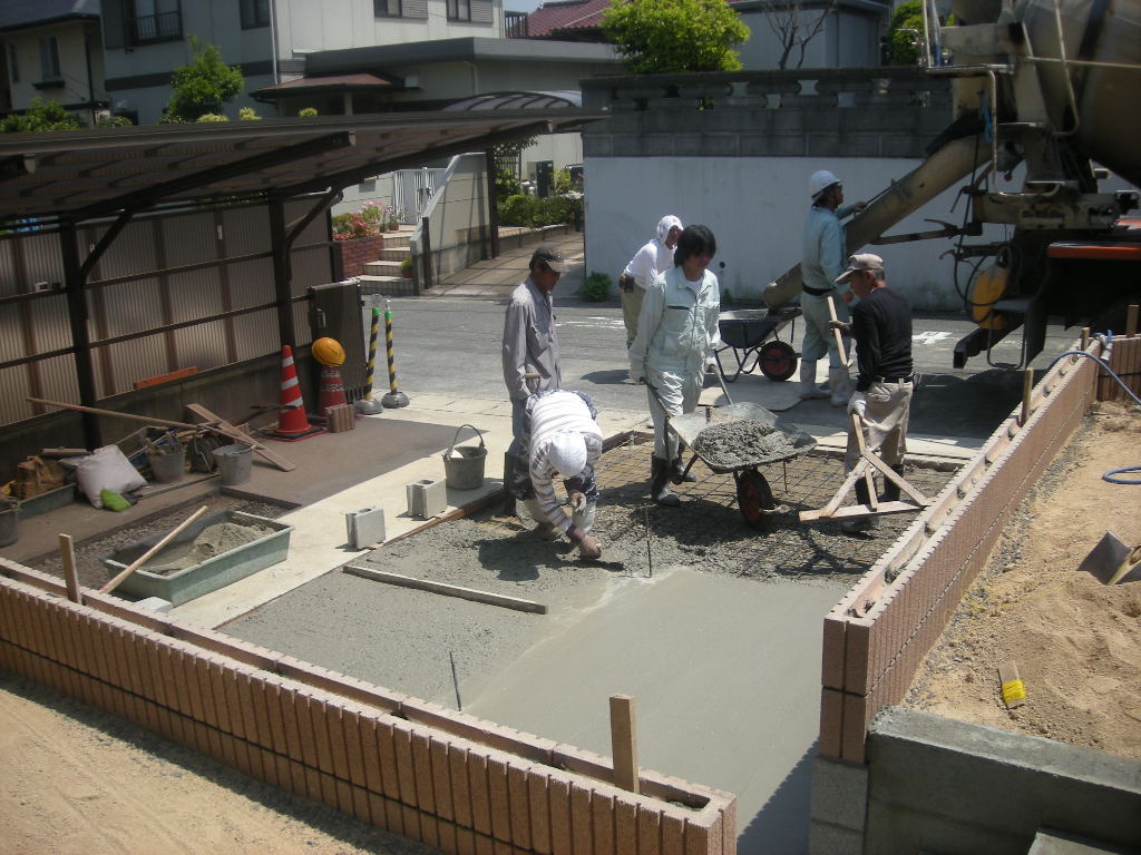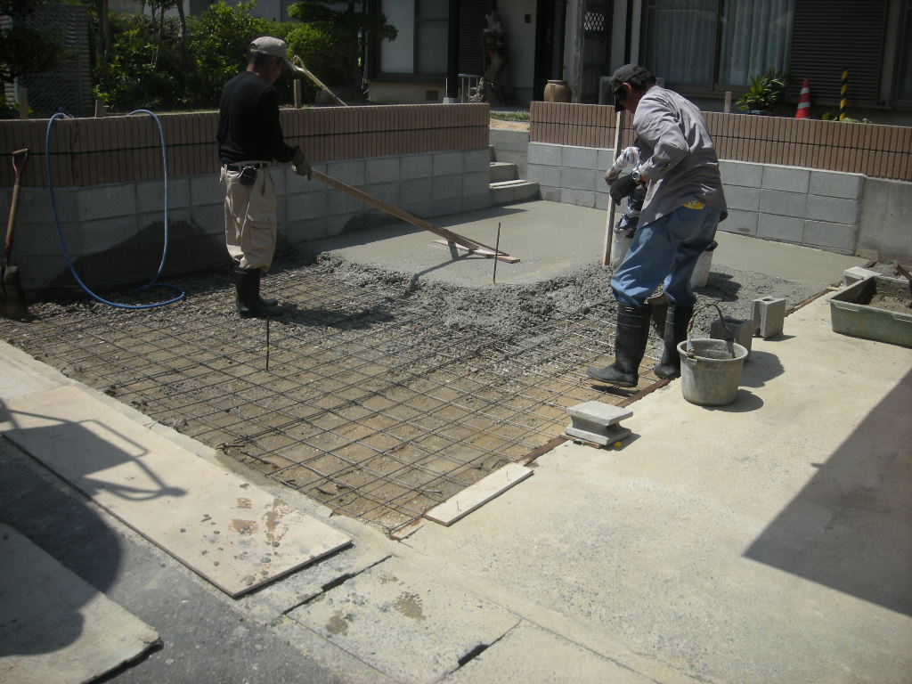 下地を整地、天圧後メッシュ筋を施工し、いよいよ最後の大仕事となるコンクリートを